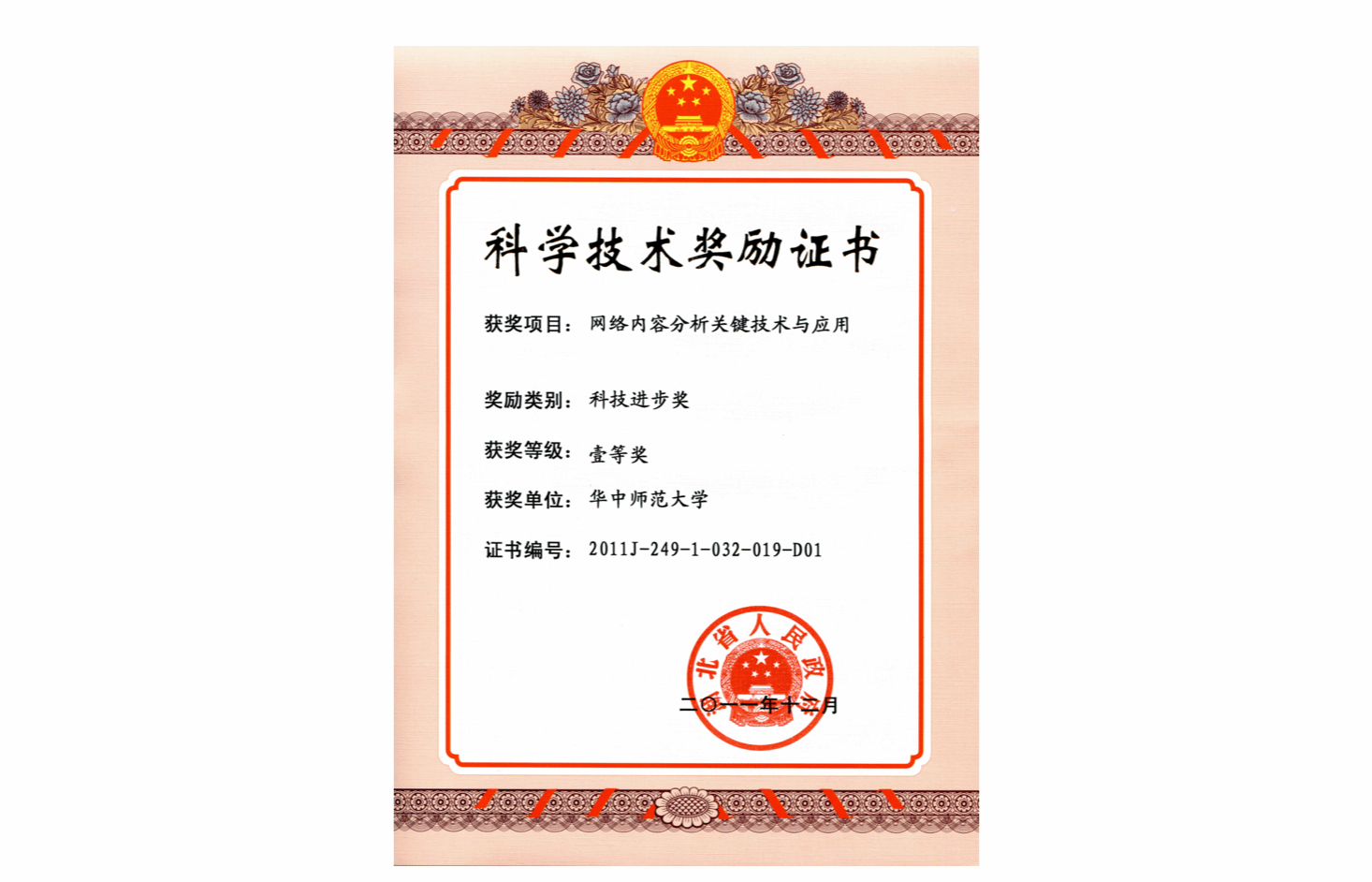 First Prize of the Hubei Provincial Science and Technology Progress Award — Key Technologies and Applications for Online Content Analysis