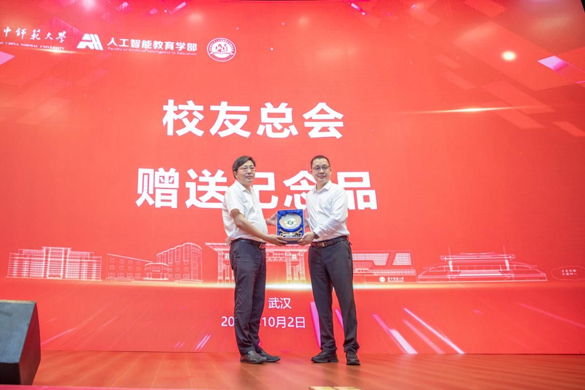 Hongda Liu read out the Approval on the Establishment of the Alumni Association of the Faculty of Artificial Intelligence in Education at Central China Normal University publicly and presented a commemorative gift on behalf of the University Alumni Association.