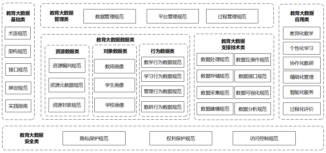 Recognizing the unstructured, distributed, heterogeneous, and decentralized characteristics of educational big data—and guided by learning sciences and educational theories—a set of standards has been formulated to create a unified system. These standards cover foundational data, resource data, entity data, behavioral data, supporting technologies, management, applications, and data security.