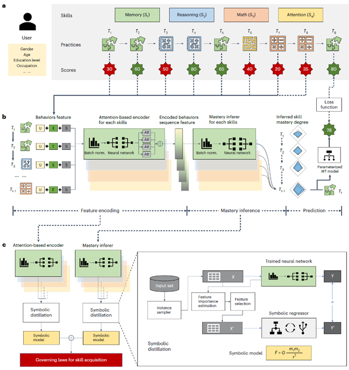 Simulation results show that this method can accurately identify key variables and reconstruct the preset skill acquisition equations within a certain range of noise, validating the effectiveness of the proposed approach. When applied to large-scale real-world cognitive skill training data, the skill acquisition patterns discovered by this method significantly outperform traditional and mainstream learning models in terms of fitness and goodness of fit. Additionally, the method uncovered two new types of cognitive skill acquisition patterns—logarithmic rate and inverse power rate—and confirmed several findings from previous studies.