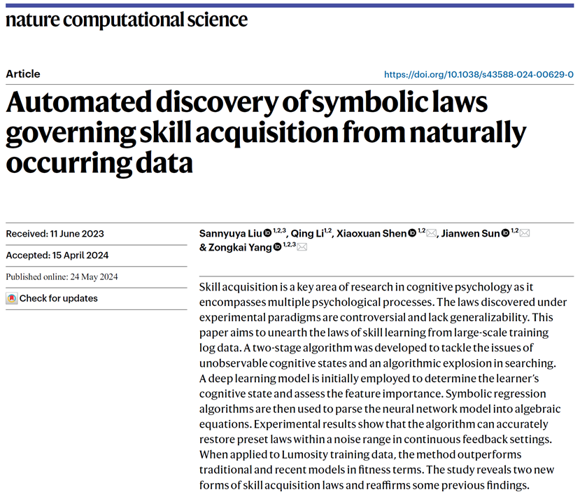 Recently, Professor Liu Sannyuya and his team from the Faculty of Artificial Intelligence in Education achieved a significant breakthrough by developing a novel method to uncover learning patterns. This approach reveals the underlying principles of cognitive skill acquisition from large-scale, naturally occurring behavioral data, offering an efficient and promising tool for educational science research. Their work, titled “Automated discovery of symbolic laws governing skill acquisition from naturally occurring data,” was published online in Nature Computational Science, a sub-journal of Nature.