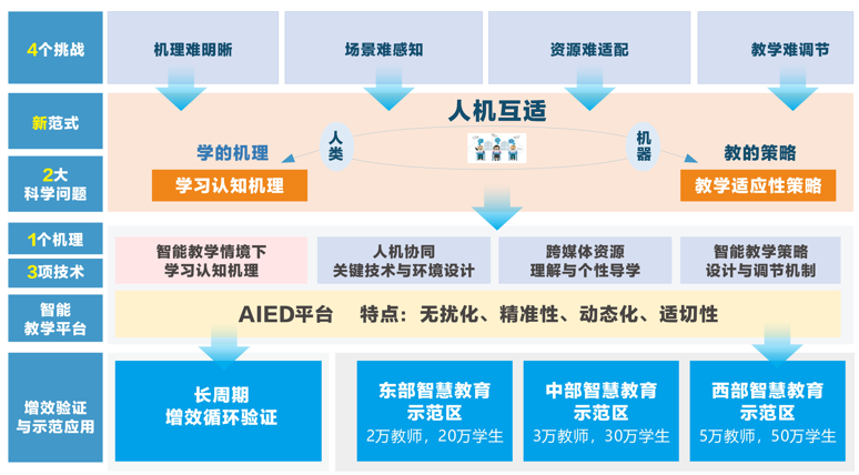 This project addresses important scientific challenges in learning cognition and adaptive strategies within human-machine collaborative teaching environments. It focuses on five key areas: understanding how learners think in intelligent teaching settings; developing core technologies and designing environments for smooth human-machine cooperation; interpreting various types of learning materials and offering personalized guidance; creating and improving intelligent teaching methods and adjustment techniques; and building and testing intelligent teaching platforms. The ultimate goal is to develop a human-machine collaborative intelligent teaching platform that meets international standards of excellence.