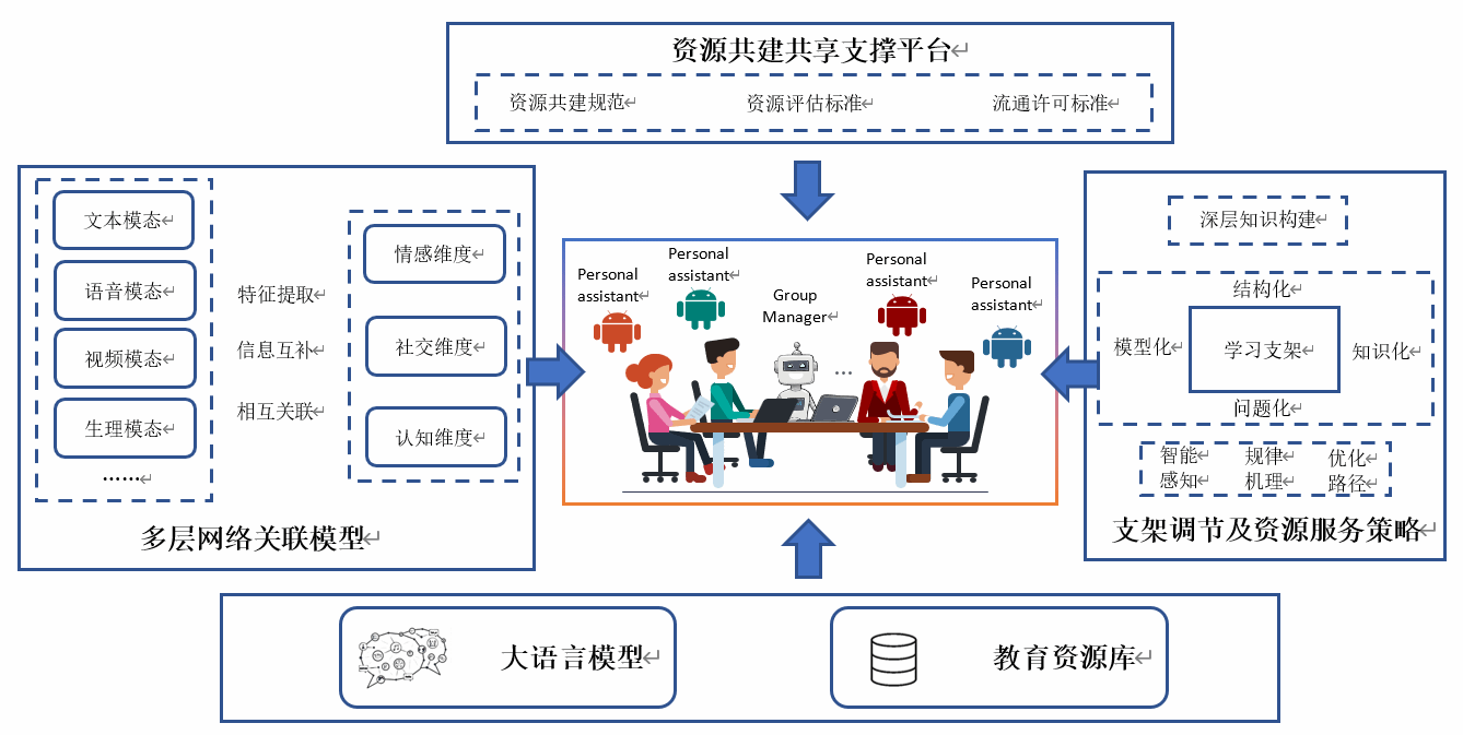 This research project aims to solve two major problems in group learning: how to make teamwork more effective and how to create smarter support systems for collaborators. By studying how emotions, social dynamics, and thought processes interact during group work, we will identify the most successful collaboration patterns and determine why they work. Our approach involves building a sophisticated computer model that combines these three key elements - emotions, social factors, and thinking patterns. We'll develop several advanced tools including real-time evaluation systems that analyze multiple data streams, AI-powered emotion management techniques, optimized workflows for team projects, and support systems for deeper learning. The project will also create methods for teams to jointly develop and share learning resources, leading to a specialized collaboration platform. The end goal is an intelligent system where human team members and AI assistants work together smoothly through coordinated digital agents that facilitate the entire collaboration process.